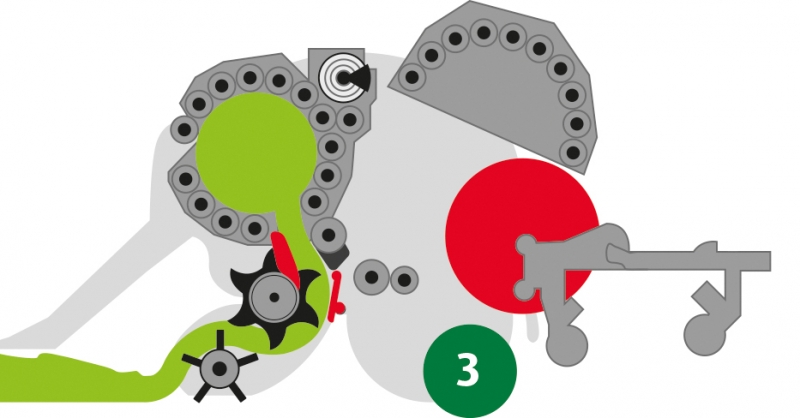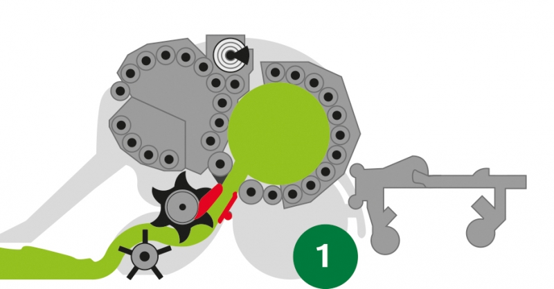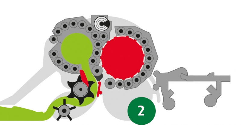 2. Když je balík úplně zformovaný, je tok píce odkloněn do předlisovací komory, zatímco se v hlavní komoře spustí vázání do sítě.