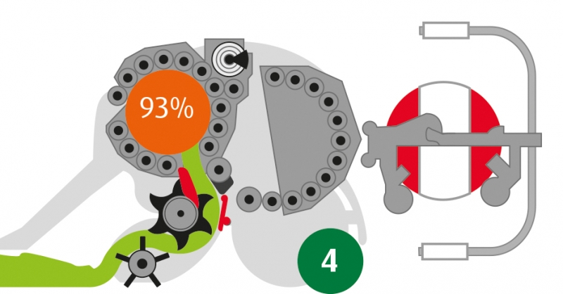 Rychlá a stabilní balička Dva satelity s otáčkami až 50 ot./min. jsou uloženy v utěsněném radiálním ložisku velkého průměru. Obíhají uvnitř rámu baličky, který je tak chrání a eliminuje nebezpečí ztráty balíku při práci na svažitých loukách. Díky stabilnímu usazení balíku probíhá ovíjení vyšší rychlostí a překrytí fólie je stejné.