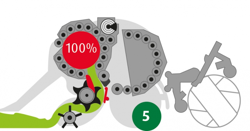 s pěti řadami prstů. Příčky nesoucí prsty jsou uloženy v ložiskách na obou stranách a vedeny vodícími drahami na pravé i levé straně. Rovněž pohon sběrače je řešen oboustranně. Proto se i při velkém objemu sbírané píce napětí rozloží rovnoměrně a nedochází ke zkrucování. Opotřebení dílů se snížilo na polovinu a životnost sběracího ústrojí se prodloužila o 50 %. Díky integrovanému pohonu kompaktních rozměrů nedošlo k nárůstu celkové šířky sběrače, a proto není nutné kopírovací kolečka sběrače demontovat nebo jakkoliv skládat při přejezdech po komunikacích.