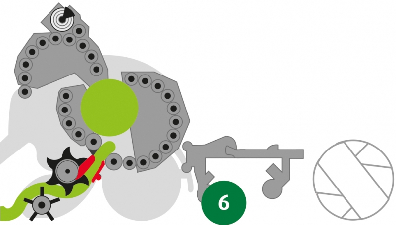 5. Tok píce nadále plní předlisovací komoru dokud není dosaženo požadované hustoty slisování píce. Hotový balík je zatím baličkou spuštěn na zem.